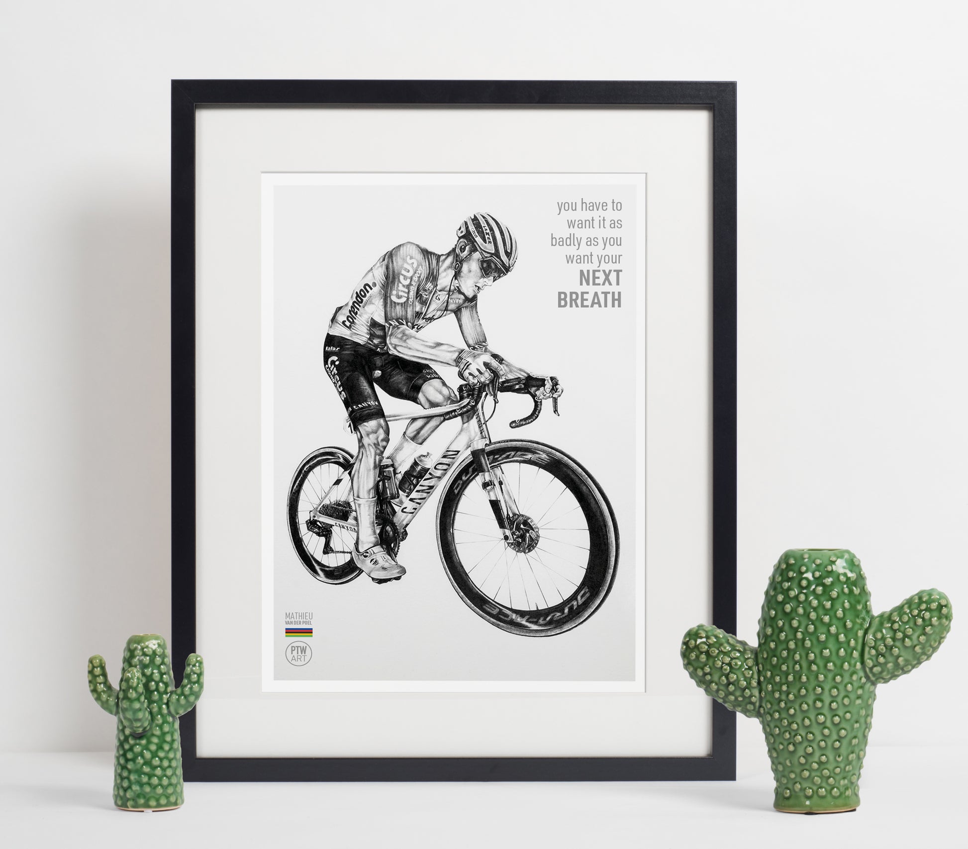 Check out these awesome A4 and A3 art prints by PTWart featuring the legendary Mathieu van der Poel! These prints capture him in his iconic Dutch champion colors, which he’s won multiple times, and now he’s added World Champion to his impressive palmarès. Printed on high-quality 210 gsm double-sided matte paper, these prints are available in two styles: classic graphite or vibrant Dutch champion colors. They're the perfect addition to any pain-cave or cycling space, adding a touch of inspiration and excitement.