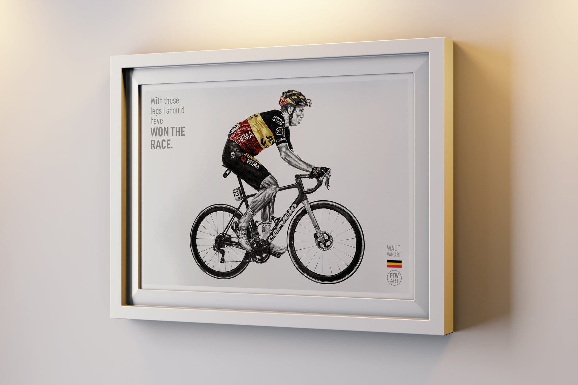 Check out these awesome A4 and A3 art prints by PTWart of Waut Van Art! They capture his legendary Mount Ventoux win in the Tour de France. Printed on high-quality 210 gsm double-sided matte paper, these prints come in two styles: classic graphite or with the bold Belgian champion colors. They're perfect for adding a touch of inspiration to any pain-cave or cycling space.